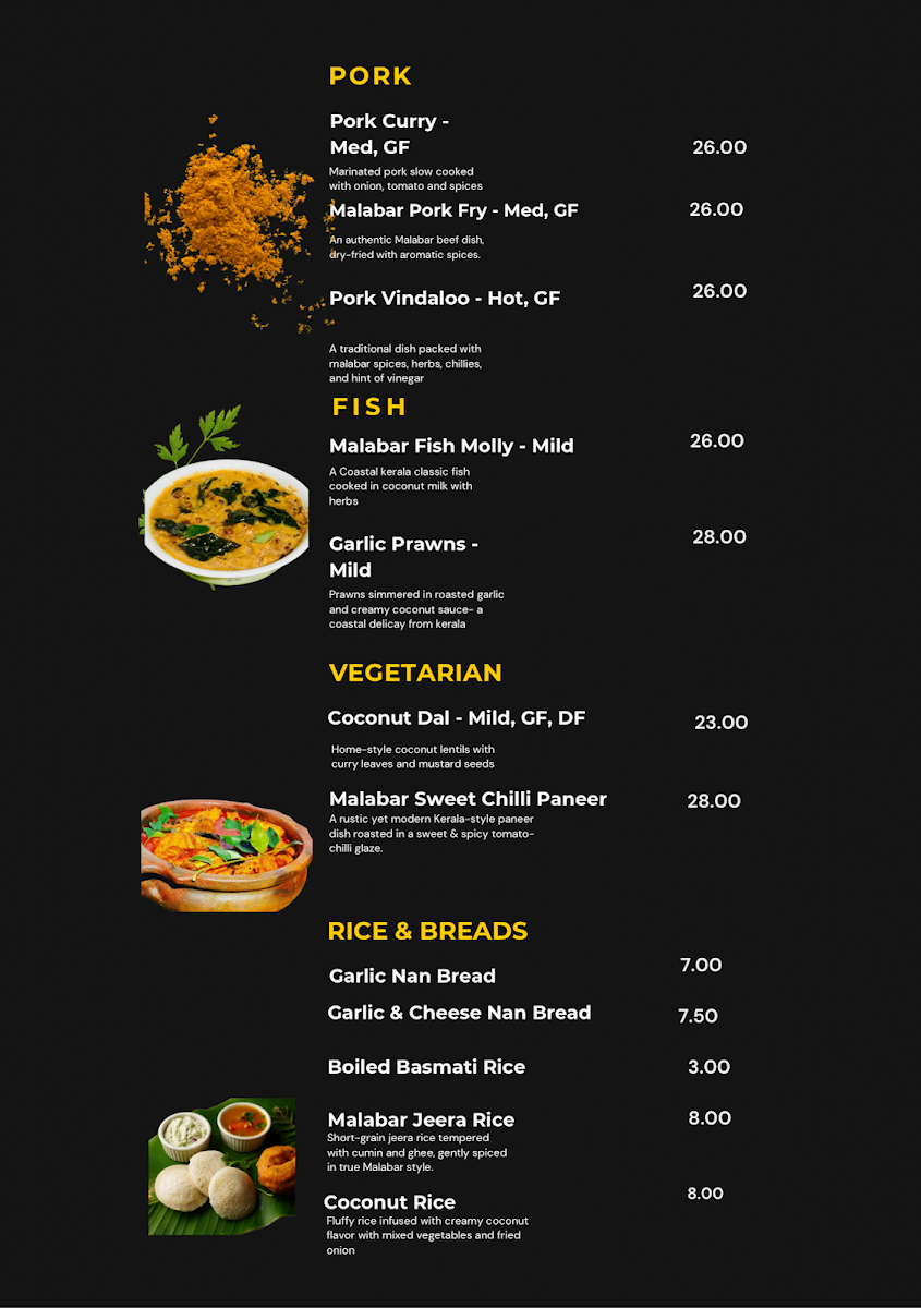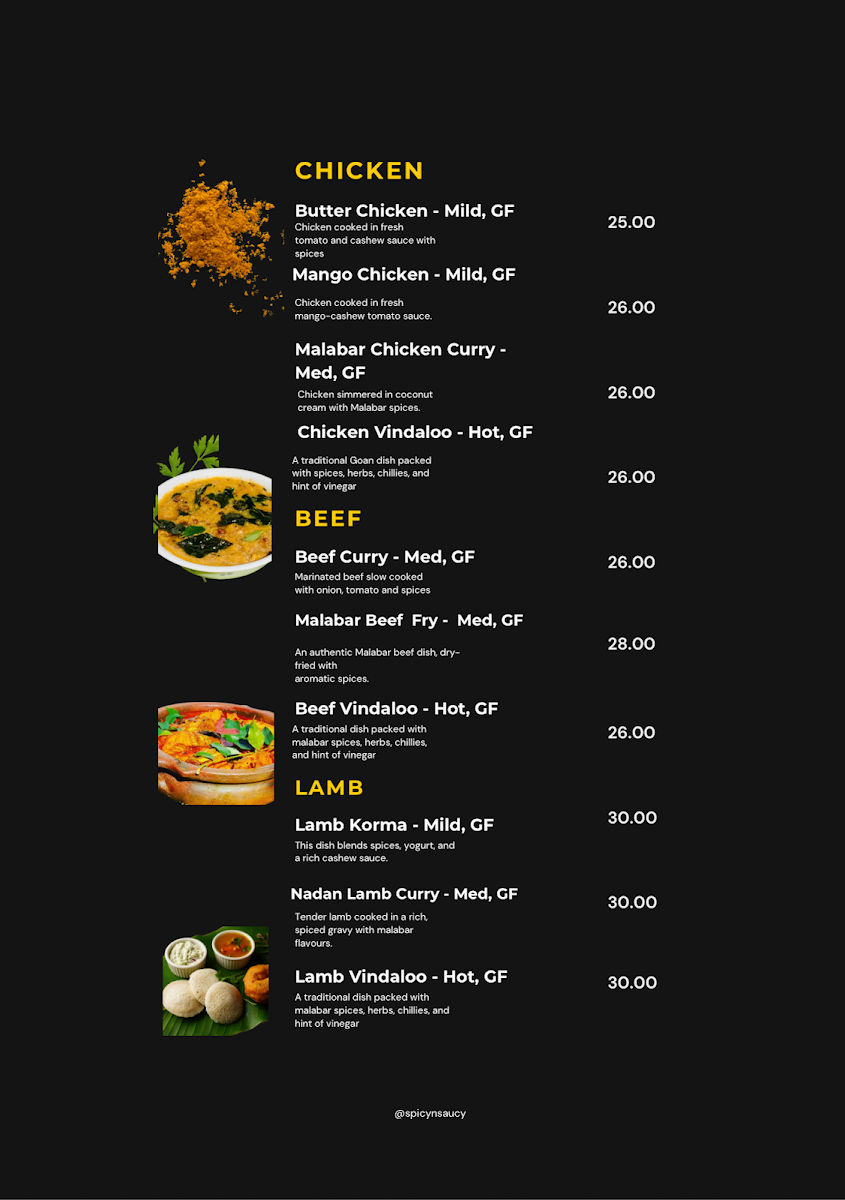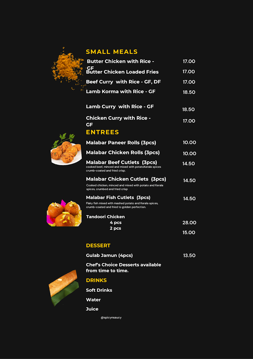 The menu at Spicy N Saucy features authentic South Indian cuisine with a focus on Kerala specialties. It includes a variety of traditional dishes commonly enjoyed throughout the day, such as breakfast items, main meals, and snacks that highlight regional flavors and cooking styles.
